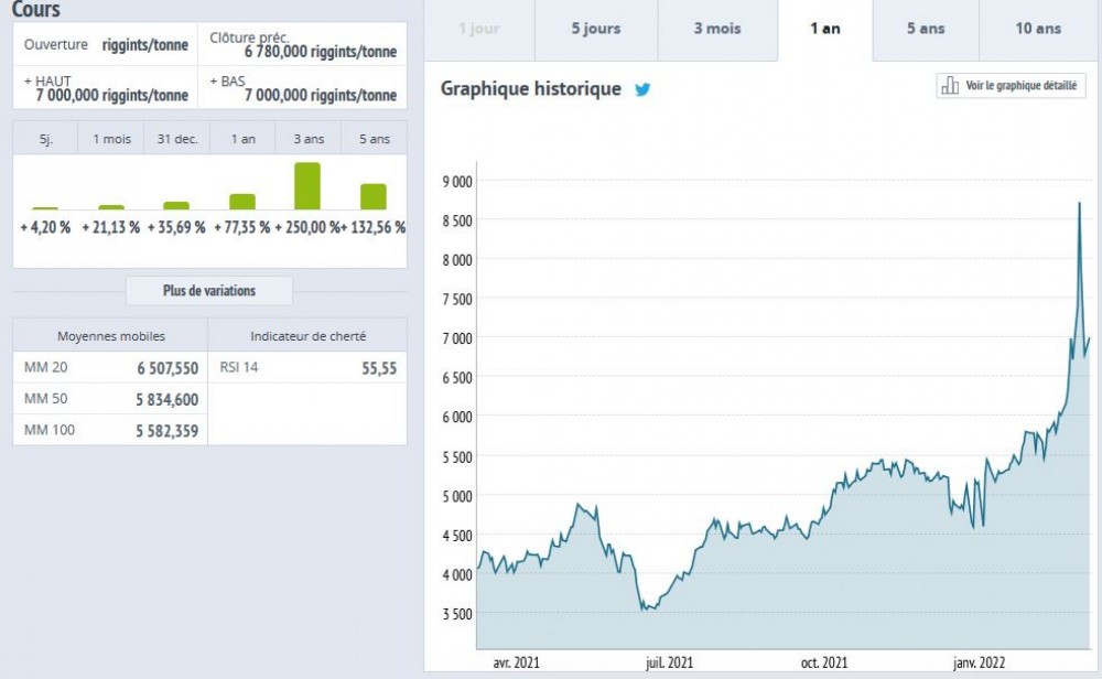 Depuis l'agression russe en Ukraine le 23 février dernier, ils ont, à l'image d'autres matières premières, spectaculairement bondit une nouvelle fois. Le 1er mars 2022, ils passaient à  8720 riggints/tonne pour s'établir à 7000 ce lundi 7 mars 2022.