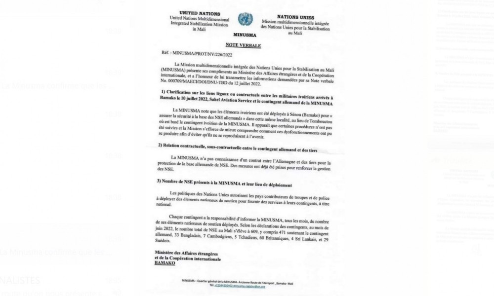 "Les éléments ivoiriens ont été déployés à Sénou (Bamako) pour « assurer la sécurité à la base des NSE (Éléments Nationaux de Soutien, ndlr) allemands » dans cette même localité, au lieu de Tombouctou"où est basé le contingent ivoirien de la MINUSMA.", clarifie la MINUSMA sur les liens légaux ou contractuels entre les militaires ivoiriens arrivés à Bamako le 10 juillet 2022, Sahel Aviation Service et le contingent allemand de la MINUSMA