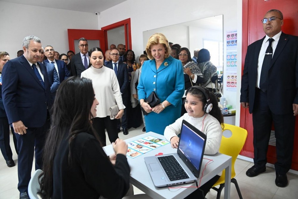 Après cette visite guidée, Madame Dominique Ouattara a pu suivre la présentation de capsules vidéo produites par le Ministère marocain de la solidarité qui met en lumière le programme d'accompagnement pédagogique dédié non seulement aux familles des enfants sourds mais aussi les défis quotidiens auxquels les sourds sont confrontés et surtout l'importance de leur inclusion dans nos sociétés. « J’ai été très heureuse de visiter le siège de la Fondation Lalla Asmaa ce matin, et je tiens à féliciter Son Altesse Royale pour cette magnifique réalisation au profit des enfants atteints de surdité. Il s’agit d’une belle opportunité qu’offre la fondation aux enfants de se réintégrer à leur environnement de vie, à travers des ateliers de théâtre et d’informatique, des activités manuelles et sportives. Félicitations aussi à tout le personnel d’encadrement qui fait un travail formidable avec les enfants », a déclaré à la presse, la Première Dame, Madame Dominique Ouattara.