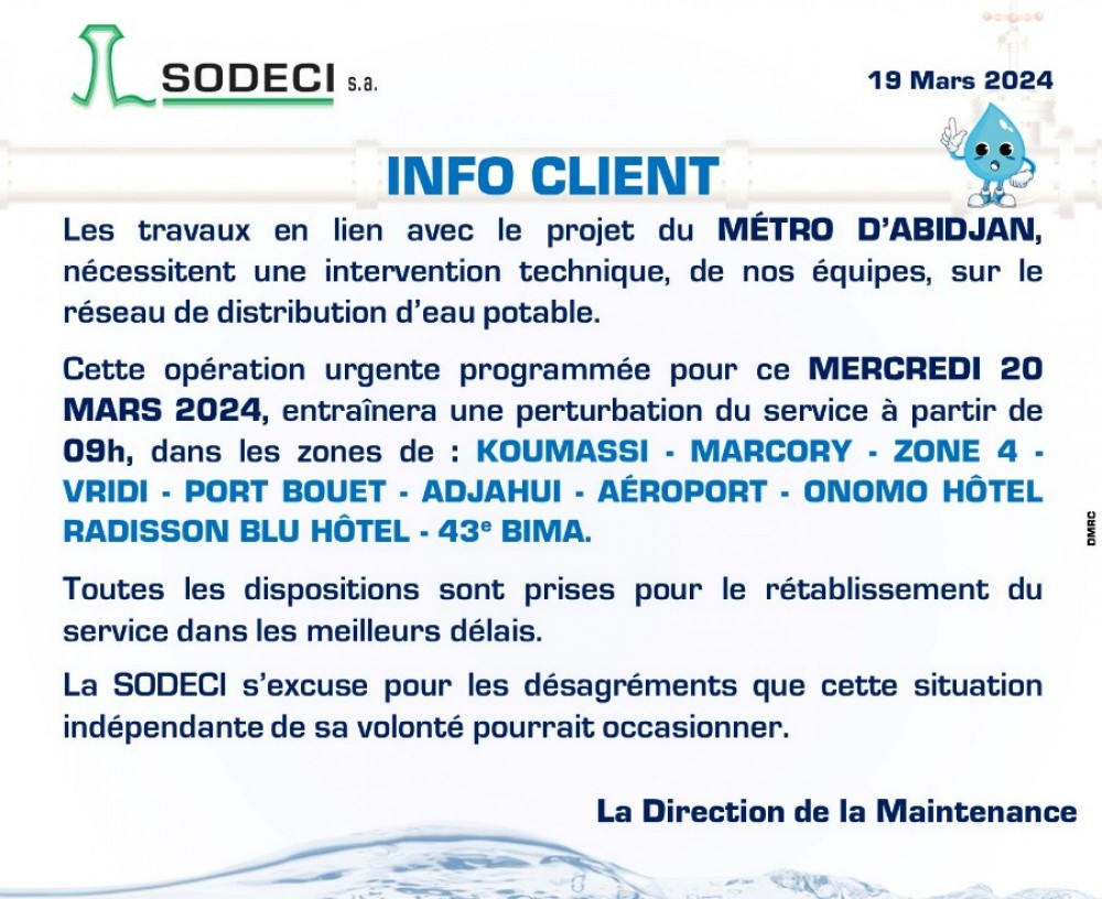 Côte d'Ivoire : Perturbation de la desserte en eau potable due aux travaux du Metro ce mercredi 20 mars à partir de 9h00