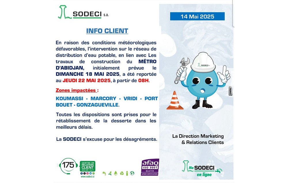 En raison des conditions météorologiques défavorables, l'intervention sur le réseau de distribution d'eau potable, en lien avec Les travaux de construction du MÉTRO D'ABIDJAN, initialement prévue le DIMANCHE 18 ΜΑΙ 2025, a été reportée au JEUDI 22 MAI 2025, à partir de 08H.