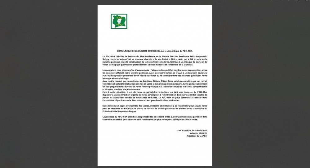Face à cette situation, il appelle la jeunesse du PDCI à prendre ses responsabilités. « Il est de notre responsabilité historique, en tant que jeunesse du PDCI-RDA, d'appeler à une redéfinition urgente de notre stratégie et à l'identification d'un autre candidat capable de porter les aspirations réelles de notre base militante. Le PDCI-RDA ne peut continuer à s'enliser dans l'attentisme ni perdre sa voix dans le concert des grandes décisions nationales. Nous lançons un appel à l'ensemble des cadres, militants et militantes à se rassembler pour sauver notre parti et redonner au PDCI-RDA la clarté, la force et la vision qui furent les siennes sous la conduite du Président Félix Houphouët-Boigny. La jeunesse du PDCI-RDA prend ses responsabilités et se tient prête à jouer pleinement sa partition dans ce combat de vérité, pour la survie et la renaissance du plus vieux parti politique de Côte d'Ivoire », a-t-il conclu.