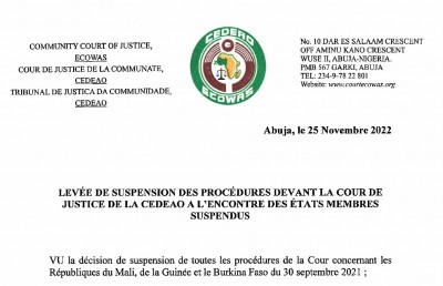 LEVÉE DE SUSPENSION DES PROCÉDURES DEVANT LA COUR DEJUSTICE DE LA CEDEAO A L'ENCONTRE DES ÉTATS...